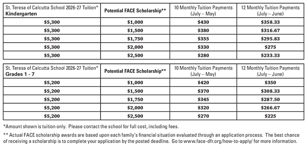 All families are encouraged to apply as awards range from $250-$2750 per student and can cover up to 50% of tuition, depending upon the school, resulting in a monthly tuition payment of $300 or less. Awards are determined by a family’s financial circumstances at the time of application and families are encouraged to complete their applications by the deadline for the best chance of receiving an award. Examples of how a FACE scholarship can reduce your monthly tuition payment are shown below:
